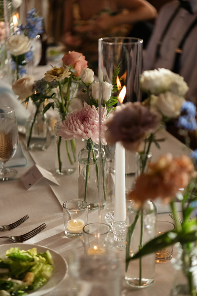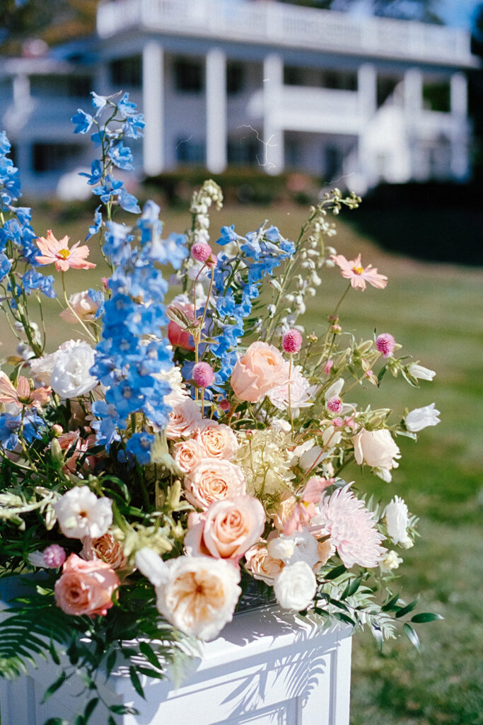 It was one of those clear, blue sky days that feels almost too perfect. The sunlight brought everything to life, especially the florals by Floribunda Designs. Soft blues and pinks added a layer of color that felt fresh and perfectly suited for an elegant summer wedding.