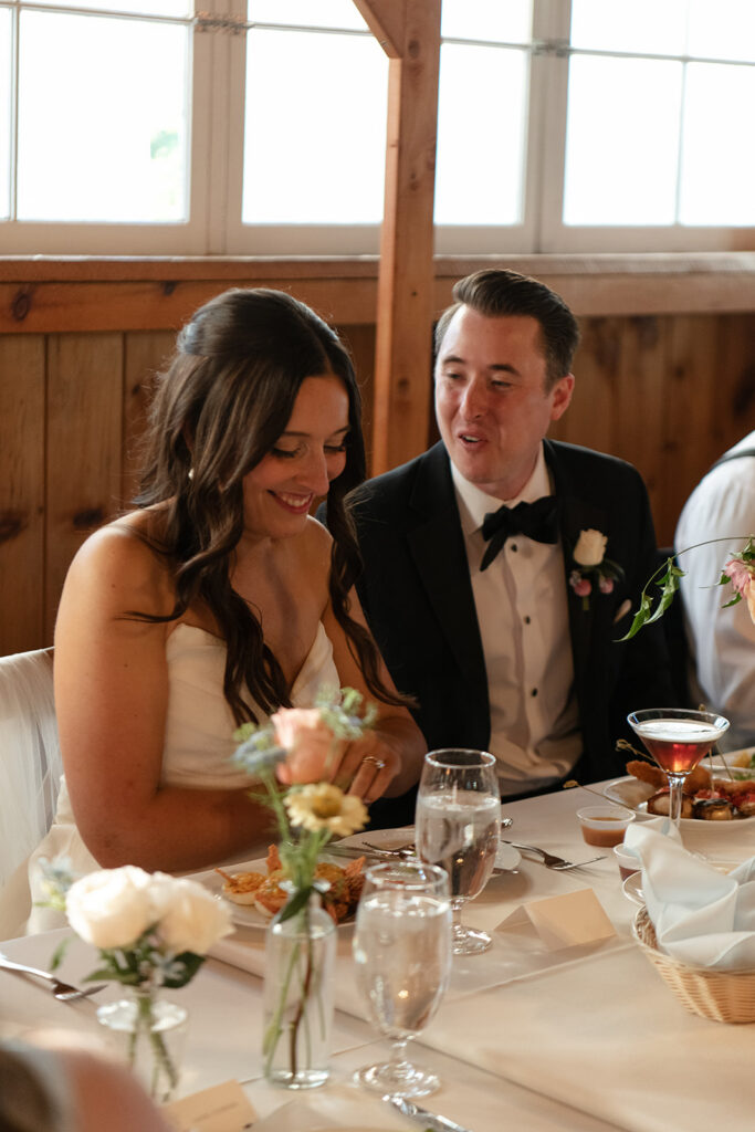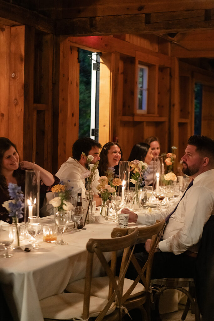 After the dances, the barn doors opened and guests made their way inside to find their seats. Dinner was served by Michael’s Hospitality, and the space quickly filled with conversation and the kind of energy that carries into the rest of the night.