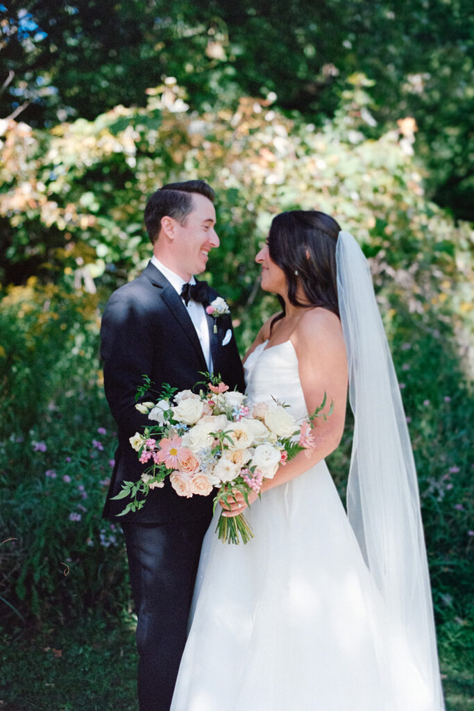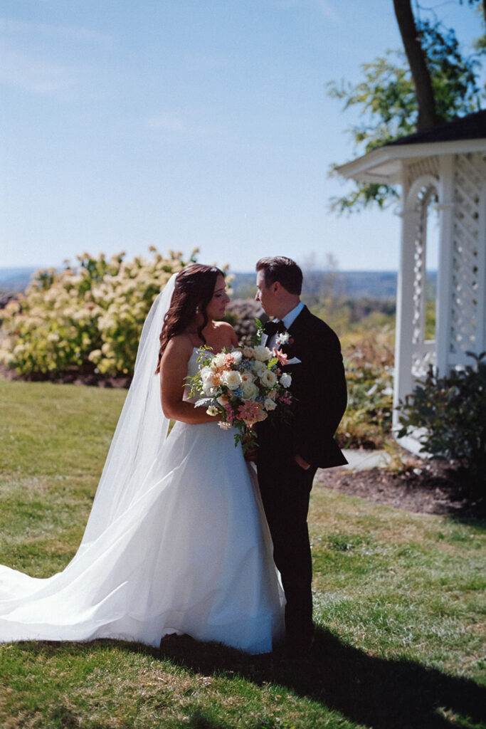 One of the things we love most about hosting an elegant summer wedding at Windridge Estate is how many different locations couples can choose from for their first look. Some spots feel open and expansive (like a first look at the Stone Wall), while others feel private and tucked away (like this one or on the Estate porch).