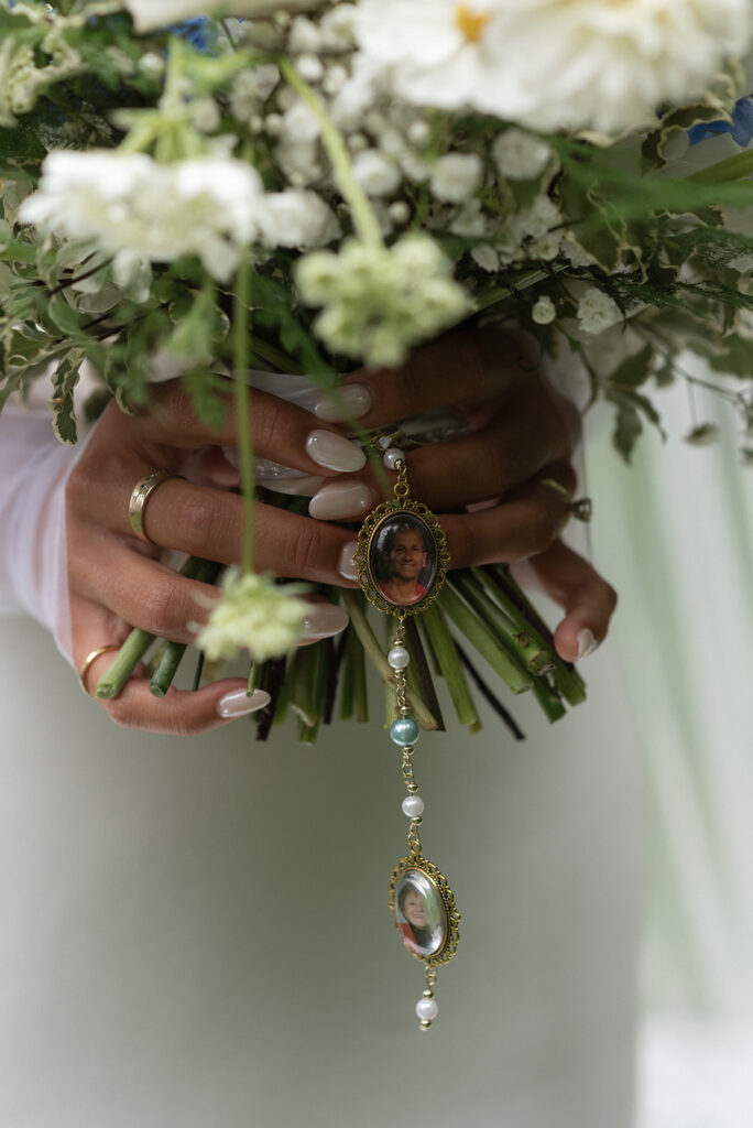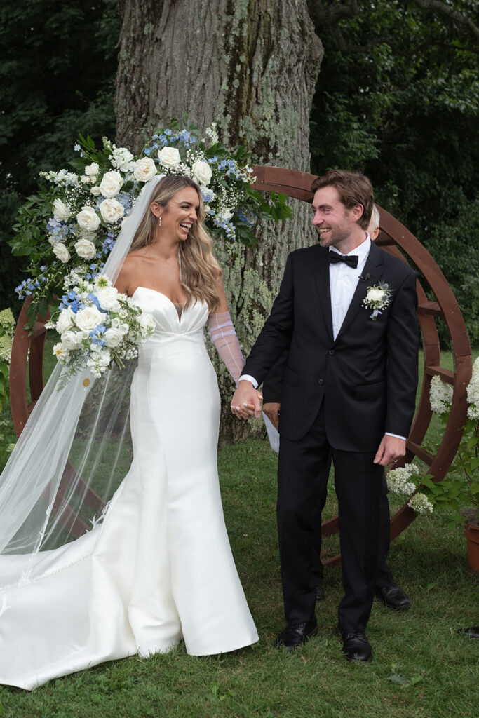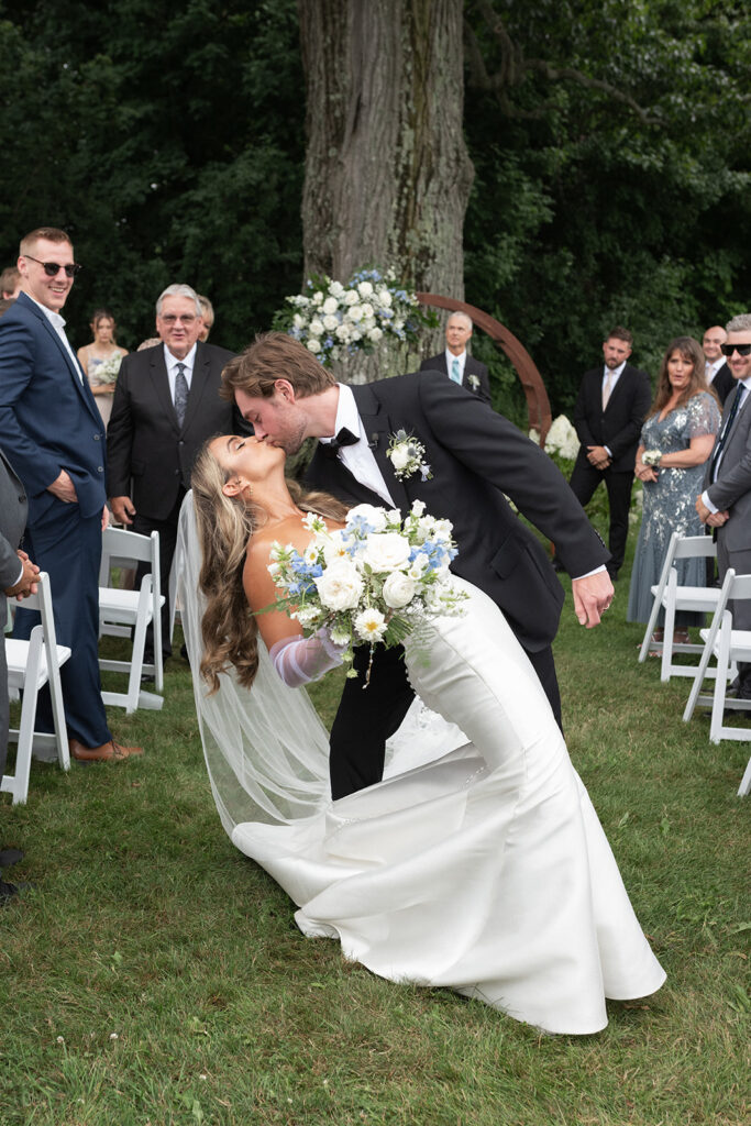 Lexi’s bouquet honored special family members, while hydrangeas and an arch framed the ceremony spot. After saying “I do”, Lexi and Keagan paused for the most iconic aisle kiss.