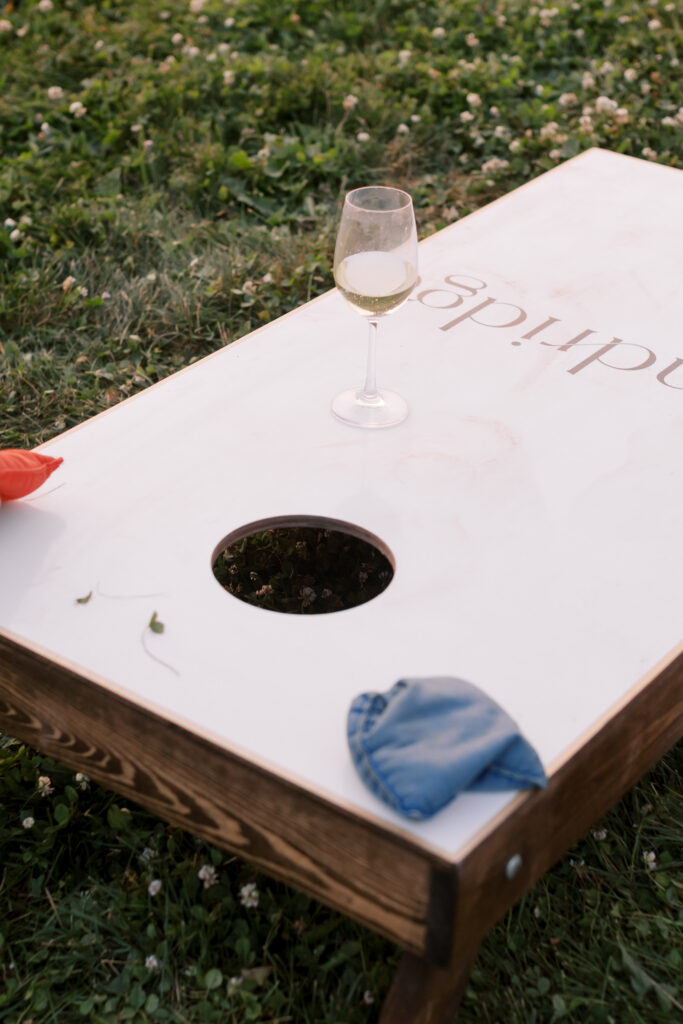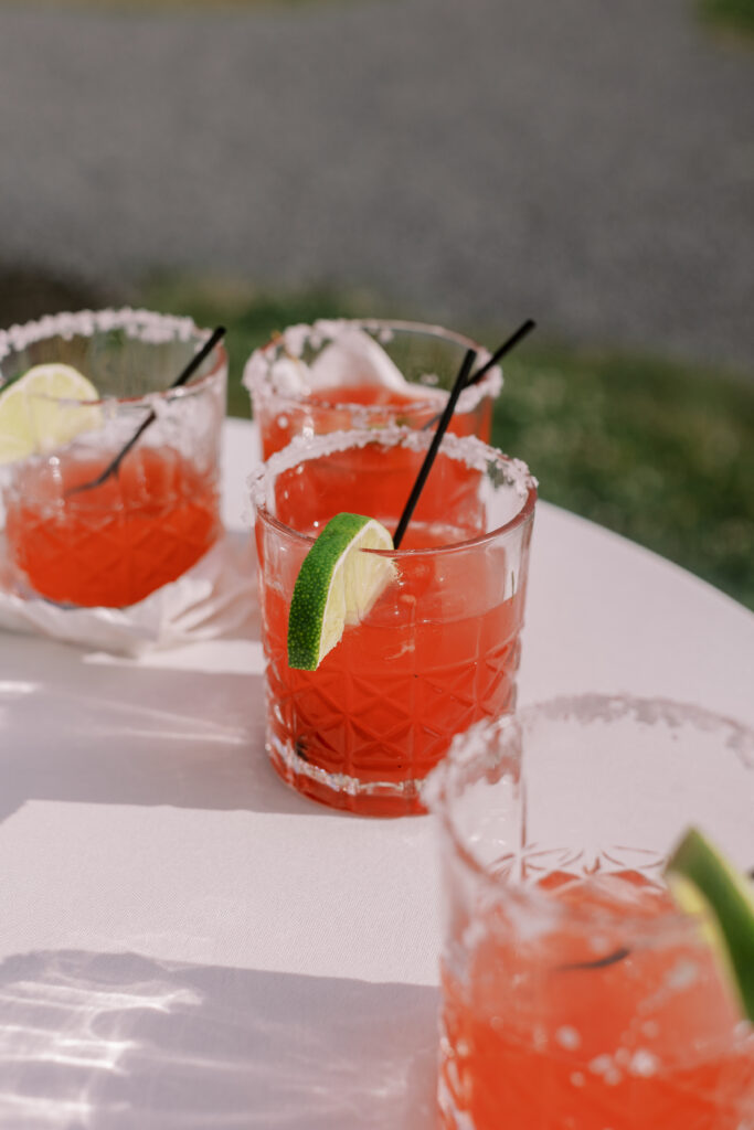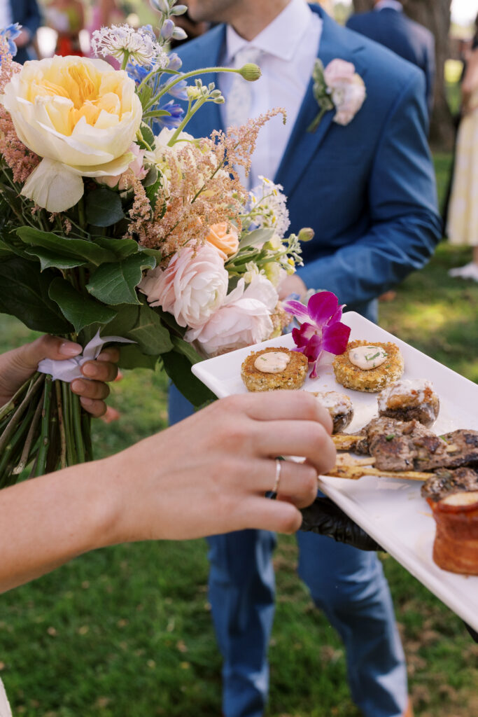 Friends gathered for drinks while taking in the views across the property. The bright summer palette appeared again in cocktail hour details, from colorful drinks to playful food presentation. Some guests wandered toward lawn games while others relaxed on the grass in small groups, catching up with friends and family.