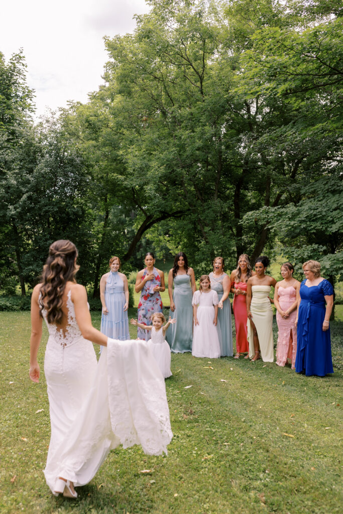At one point, Liz and Sean’s dog curled up beneath the table nearby, calmly watching the morning unfold. Moments like that always add something special to the start of a wedding day. Liz chose bright dresses for her bridesmaids that reflected the colorful summer palette she had envisioned, and those cheerful tones carried throughout the celebration.
