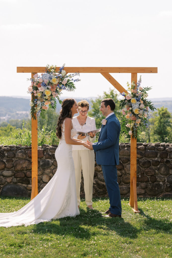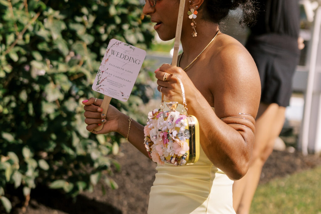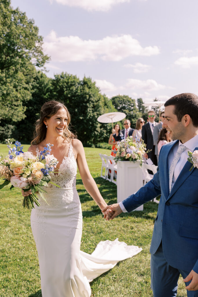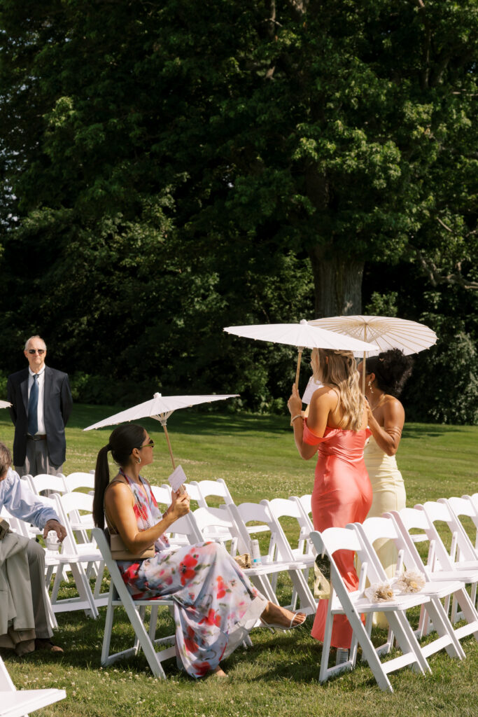 Liz and Sean chose florals that complemented the space while adding vibrant color to the ceremony. Many guests held parasols to stay comfortable in the July sunshine, and the soft colors created a charming scene across the lawn as everyone gathered together.